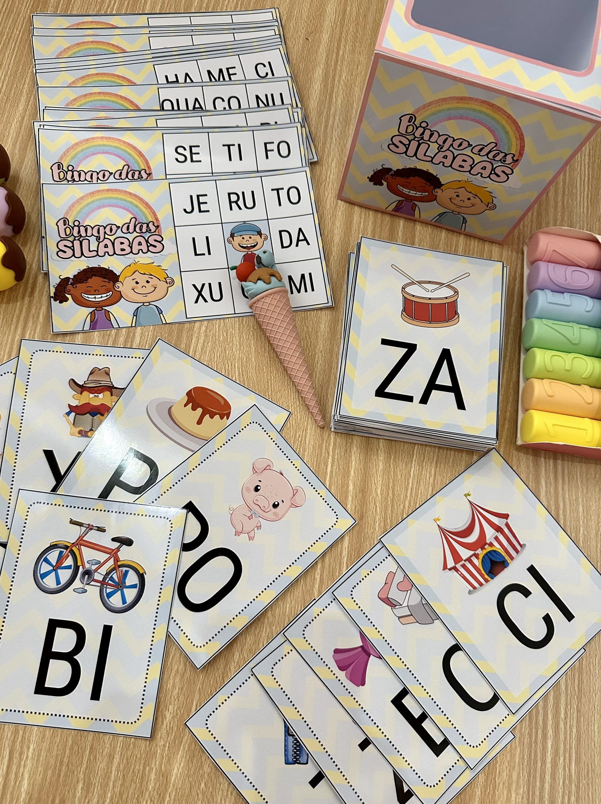 O arquivo inclui 20 cartelas diferentes, fichas com todas as sílabas das famílias silábicas simples e uma caixinha para o sorteio, tornando a atividade completa, organizada e prática para o uso em sala de aula ou em casa.