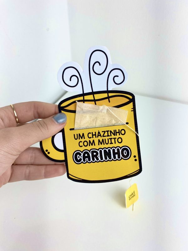 O cartão do chá vem com espaço para ser cortado com estilete e colocado um saquinho de chá para presentear.
