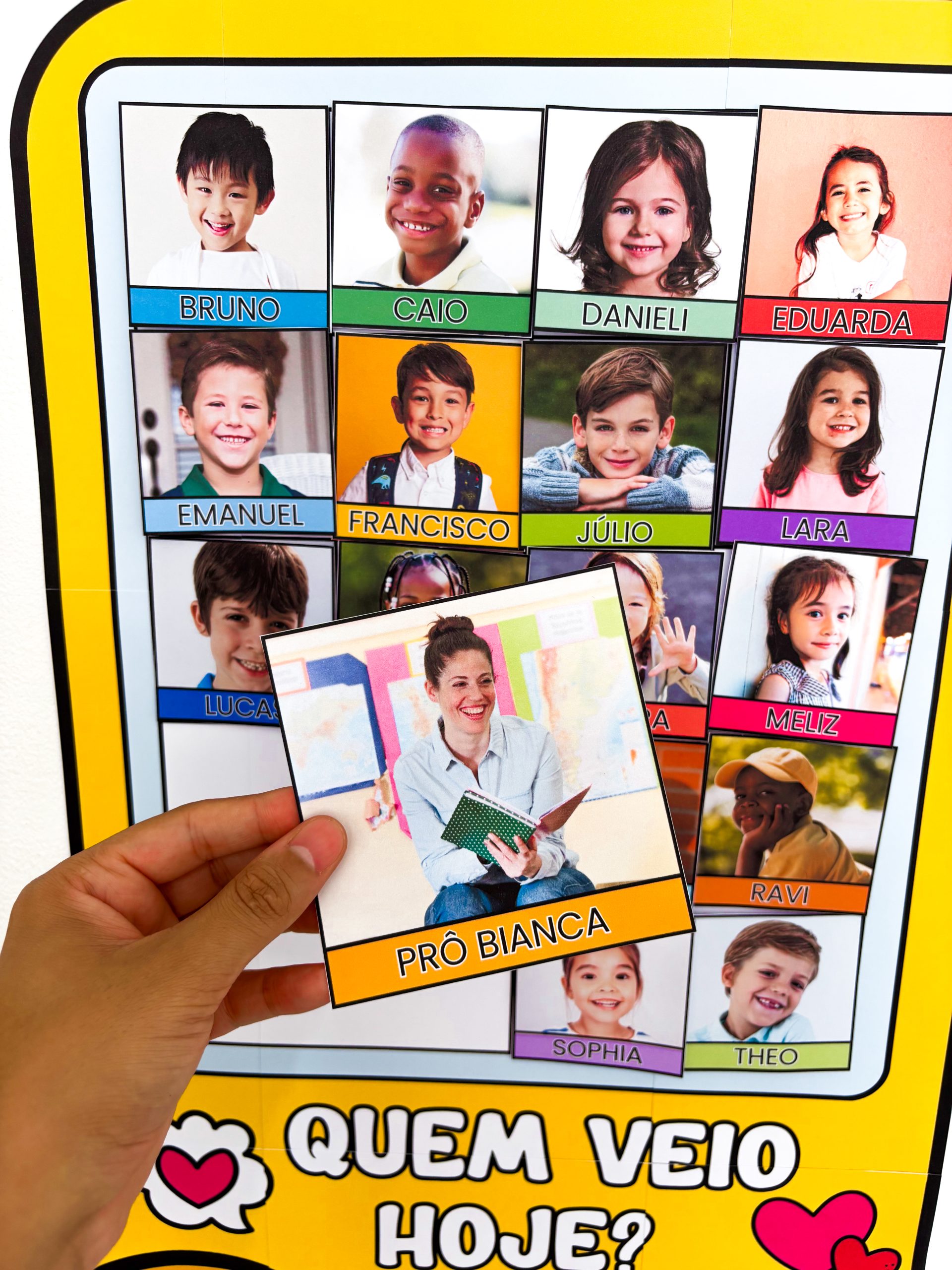 Essa chamadinha com foto no formato de ônibus transforma o momento da presença em algo que a criança vive, participa e se reconhece.