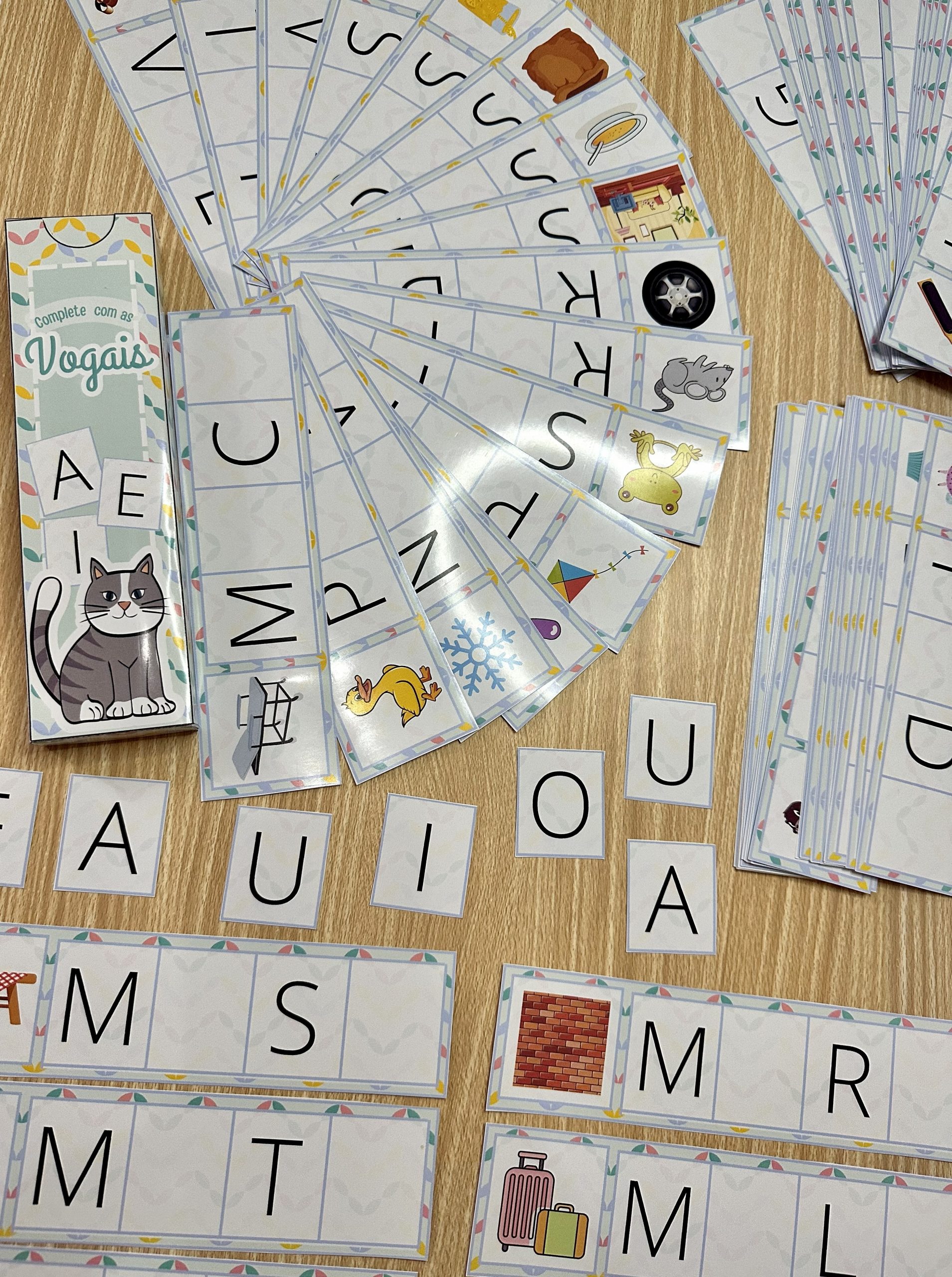 📘 O material inclui 68 fichas com palavras simples para serem completadas com as vogais, promovendo a ampliação do vocabulário e o avanço gradual no processo de leitura e escrita.