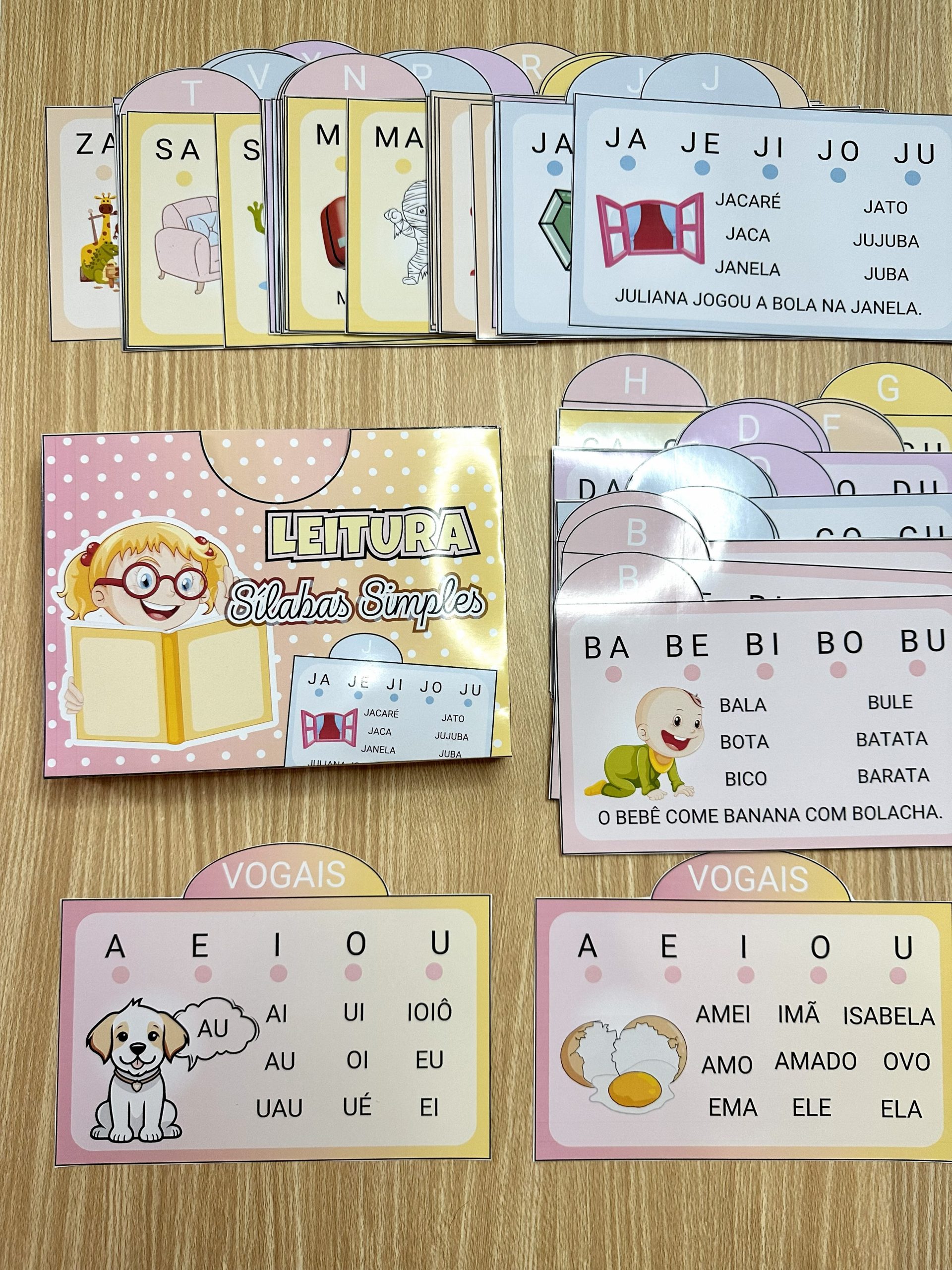 As fichas são organizadas por cores e trazem identificação superior, facilitando a separação e o uso conforme as famílias silábicas simples. O material contempla palavras e frases, promovendo uma progressão natural no processo de leitura.