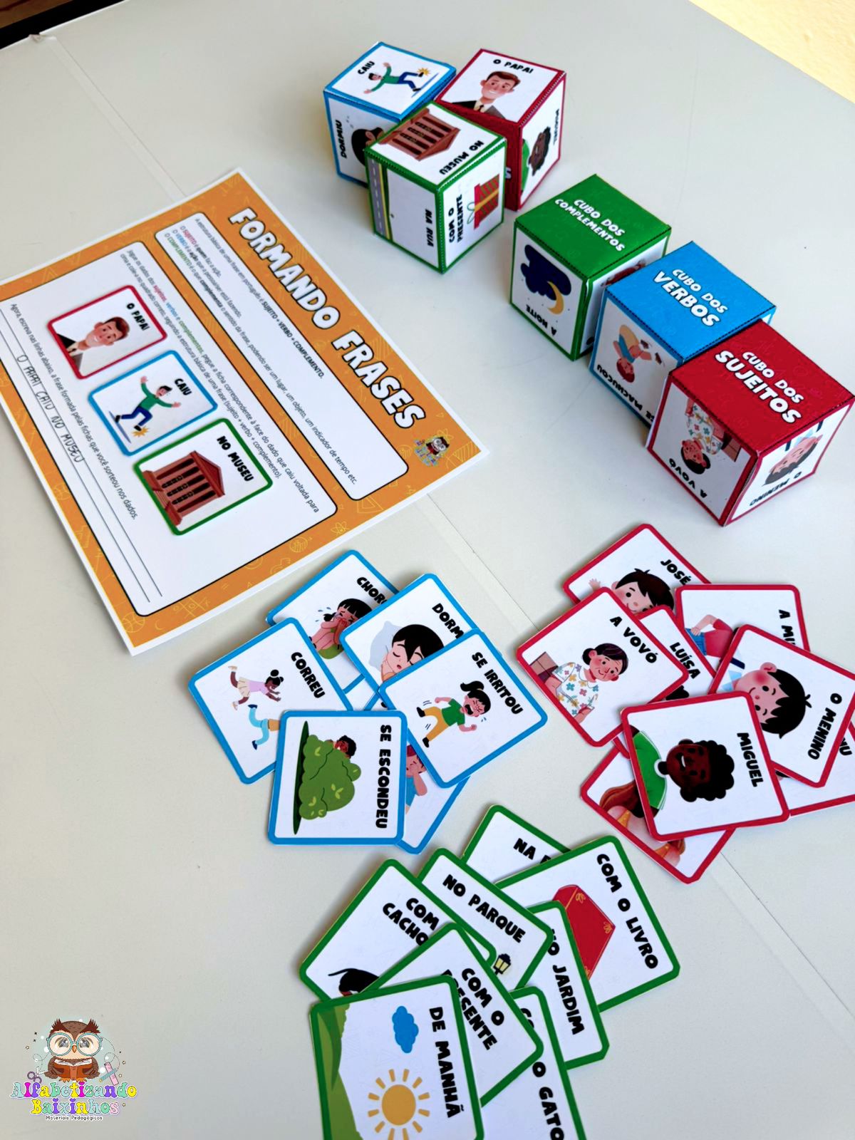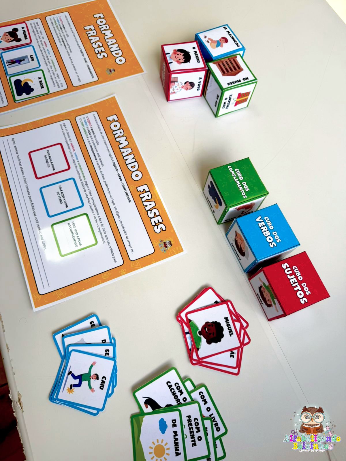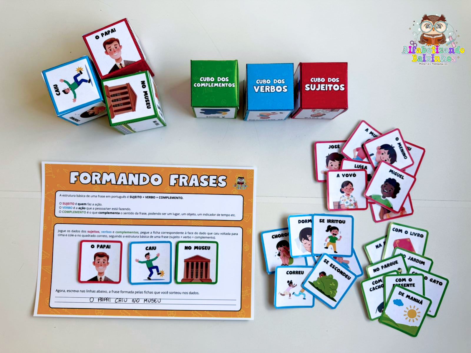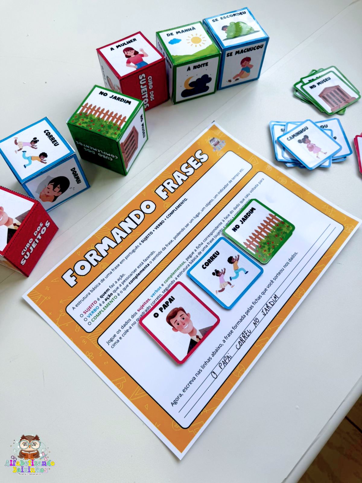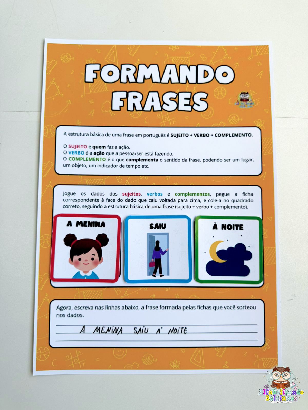 Com este arquivo de 12 páginas, a criança monta frases jogando os dados de Sujeito + Verbo + Complemento.