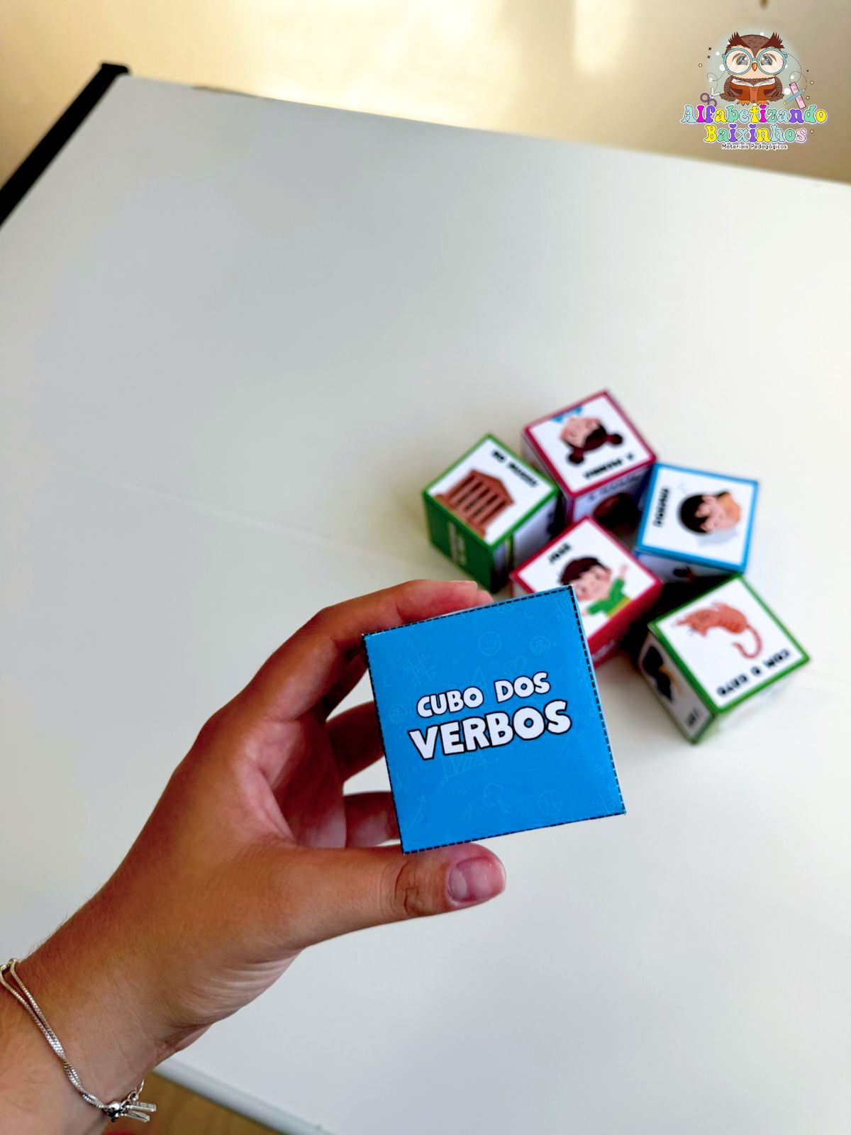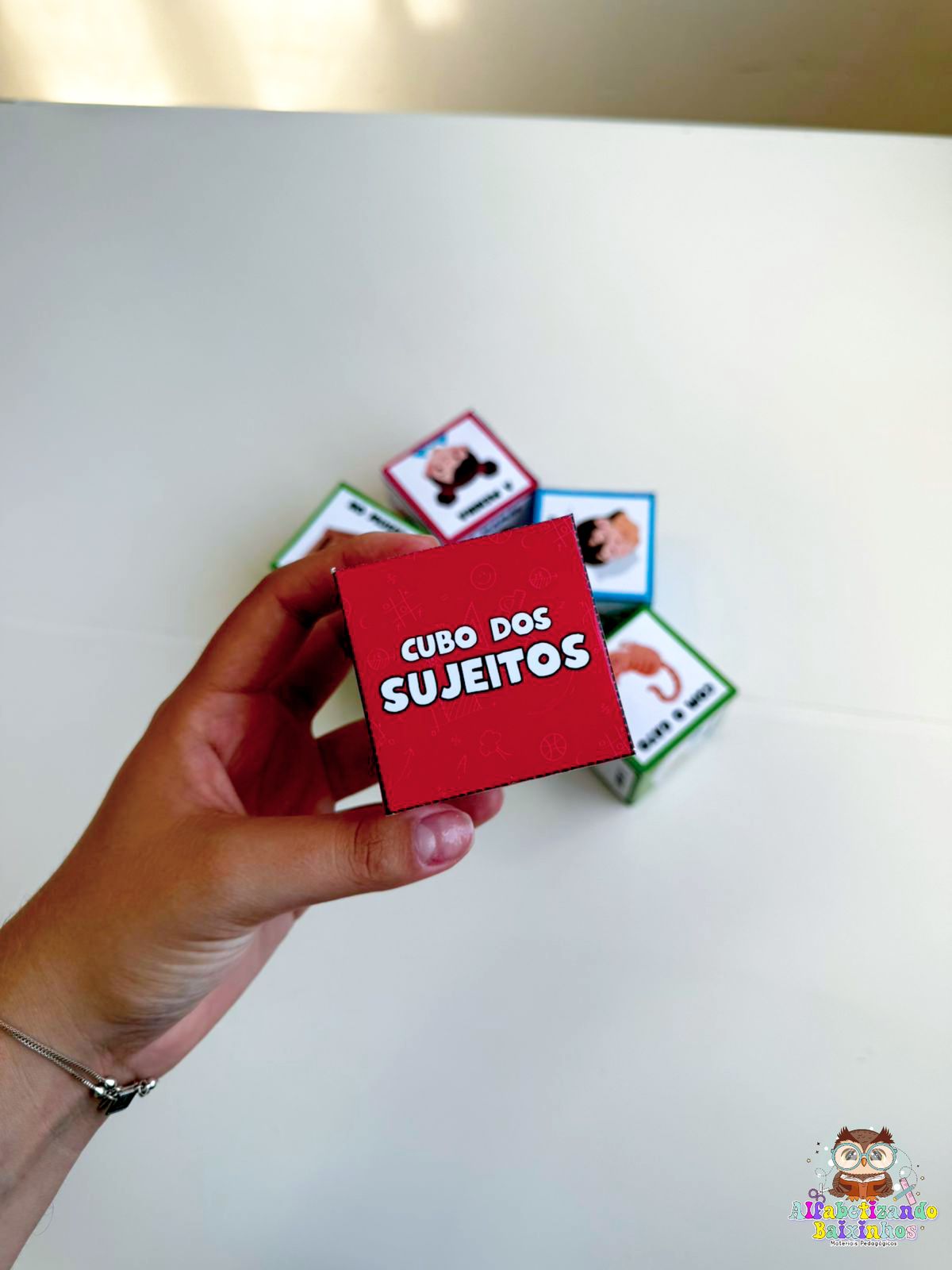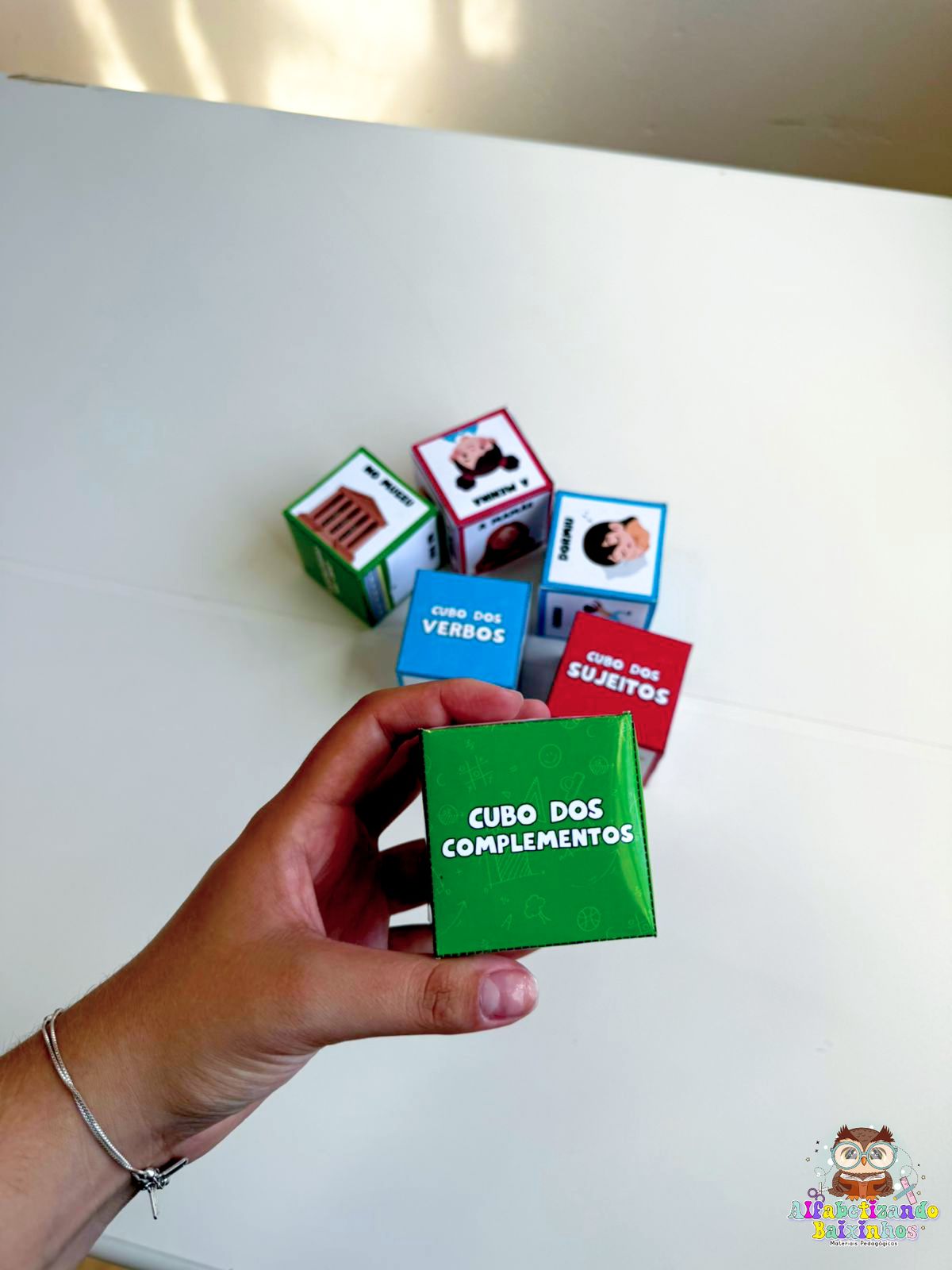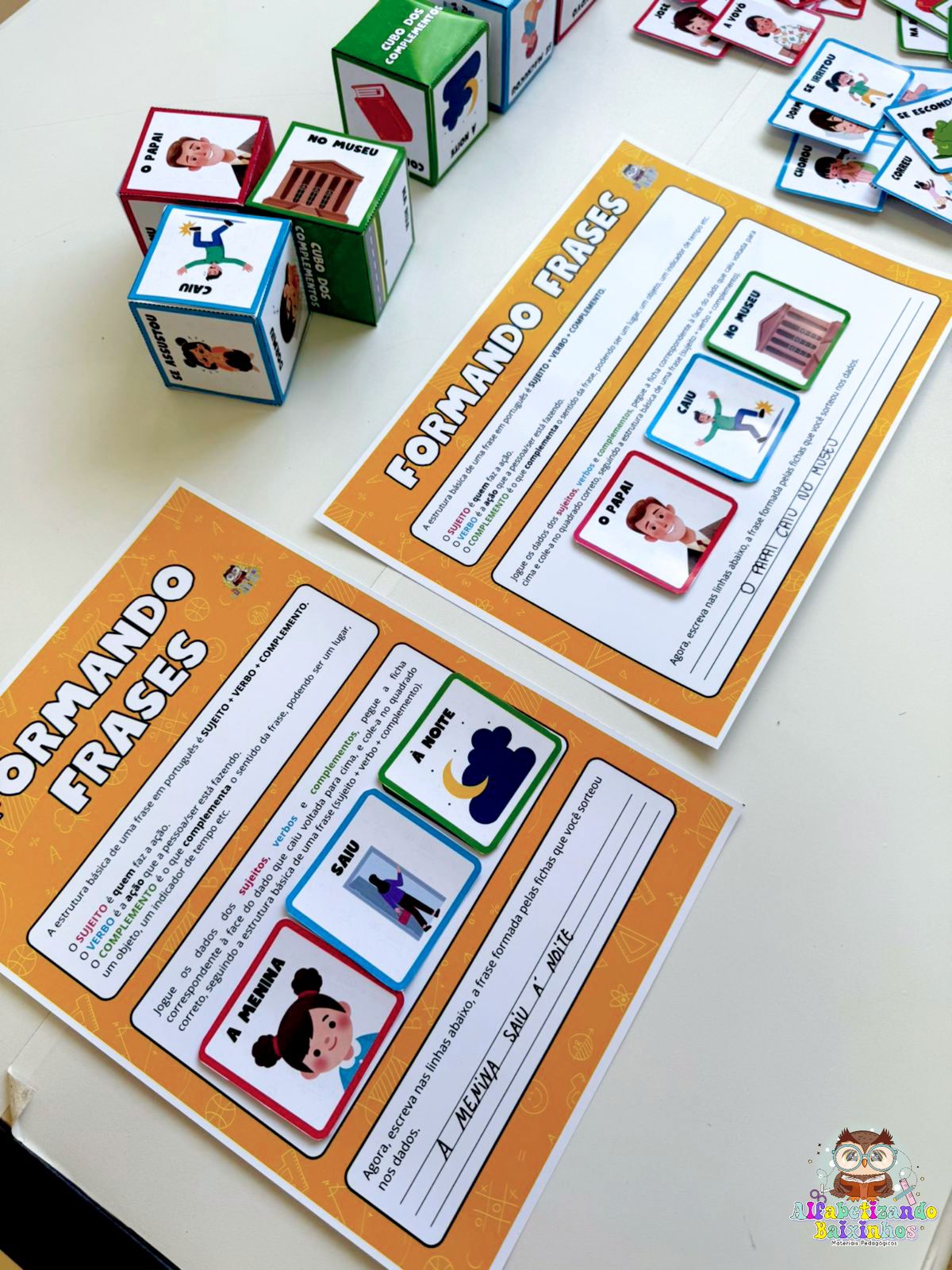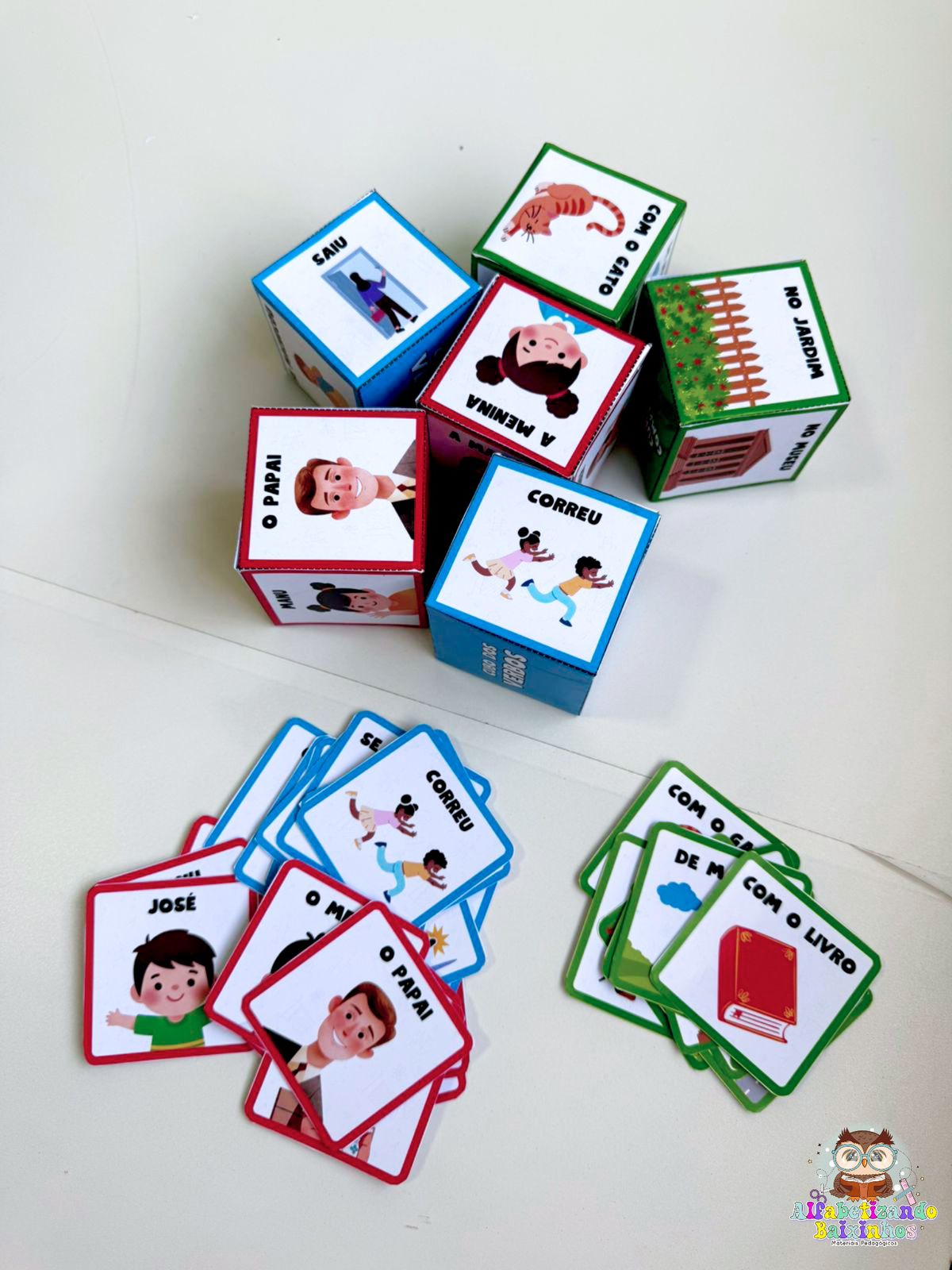 Com este arquivo de 12 páginas, a criança monta frases jogando os dados de Sujeito + Verbo + Complemento.