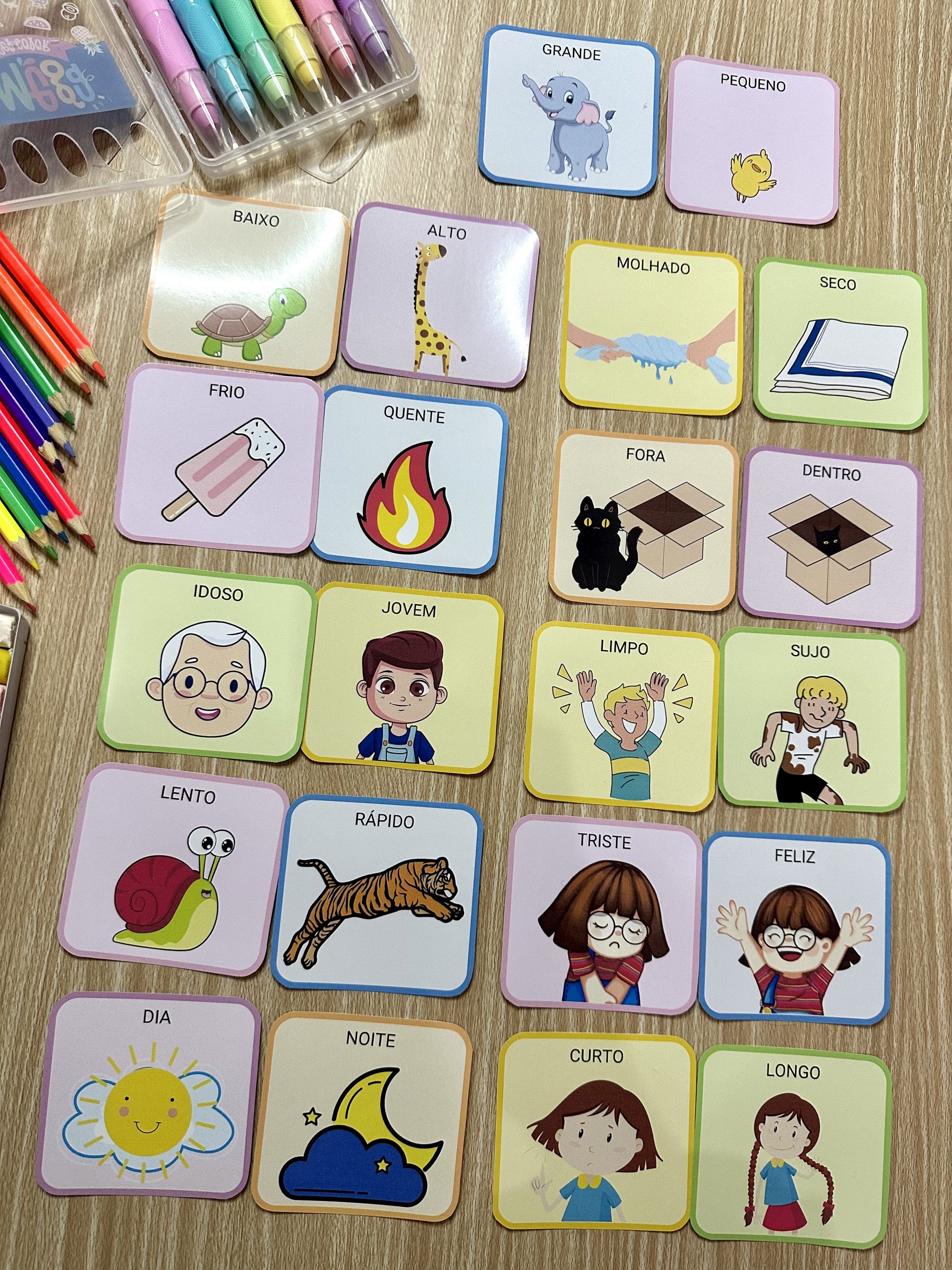 O arquivo inclui 15 pares de cards ilustrados, com imagens claras e atrativas que ajudam os pequenos a compreender noções como grande x pequeno, cheio x vazio, feliz x triste e muito mais!