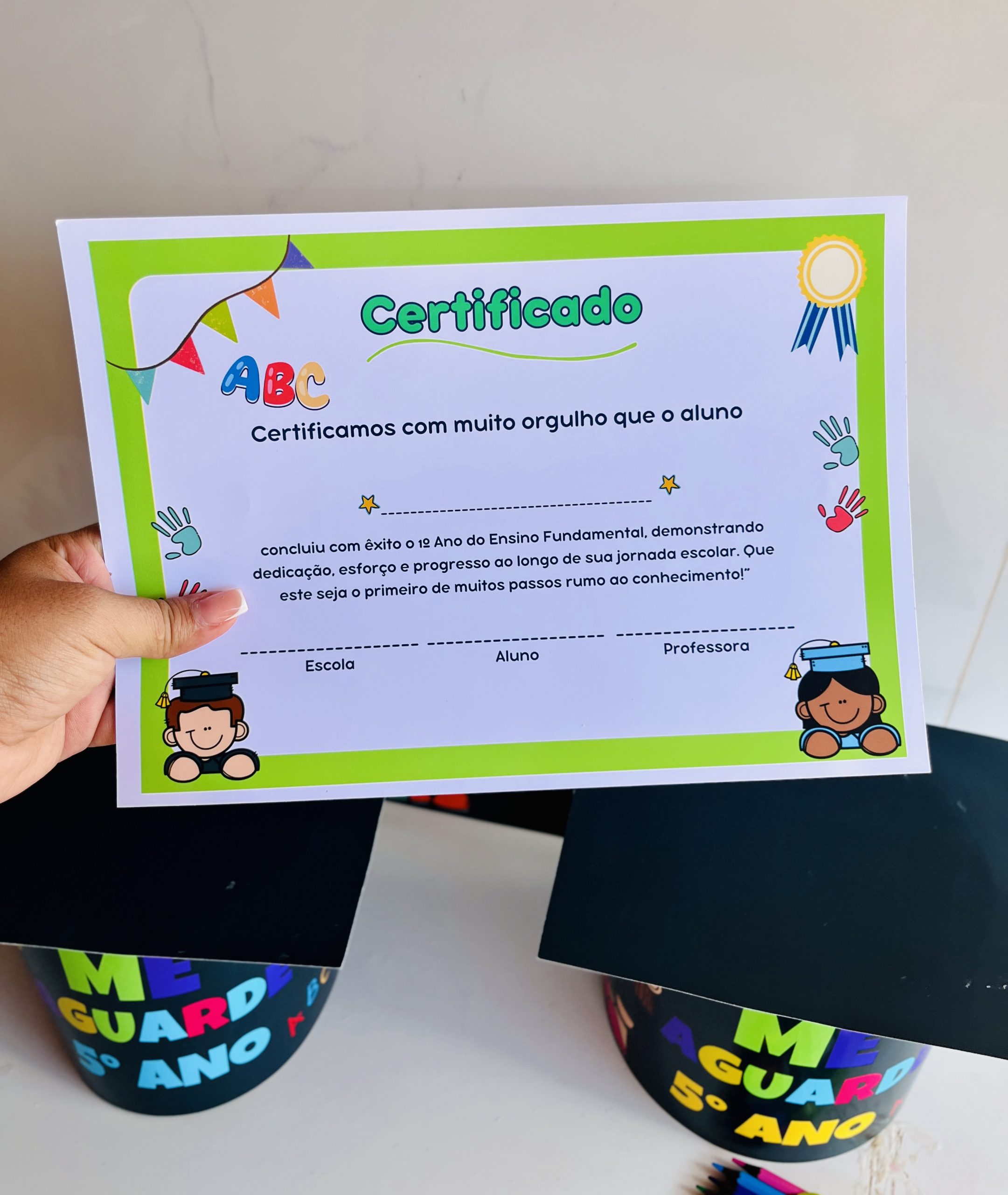 • Certificados de conclusão do 1º ao 5º ano — com espaço para nome, turma e assinatura;