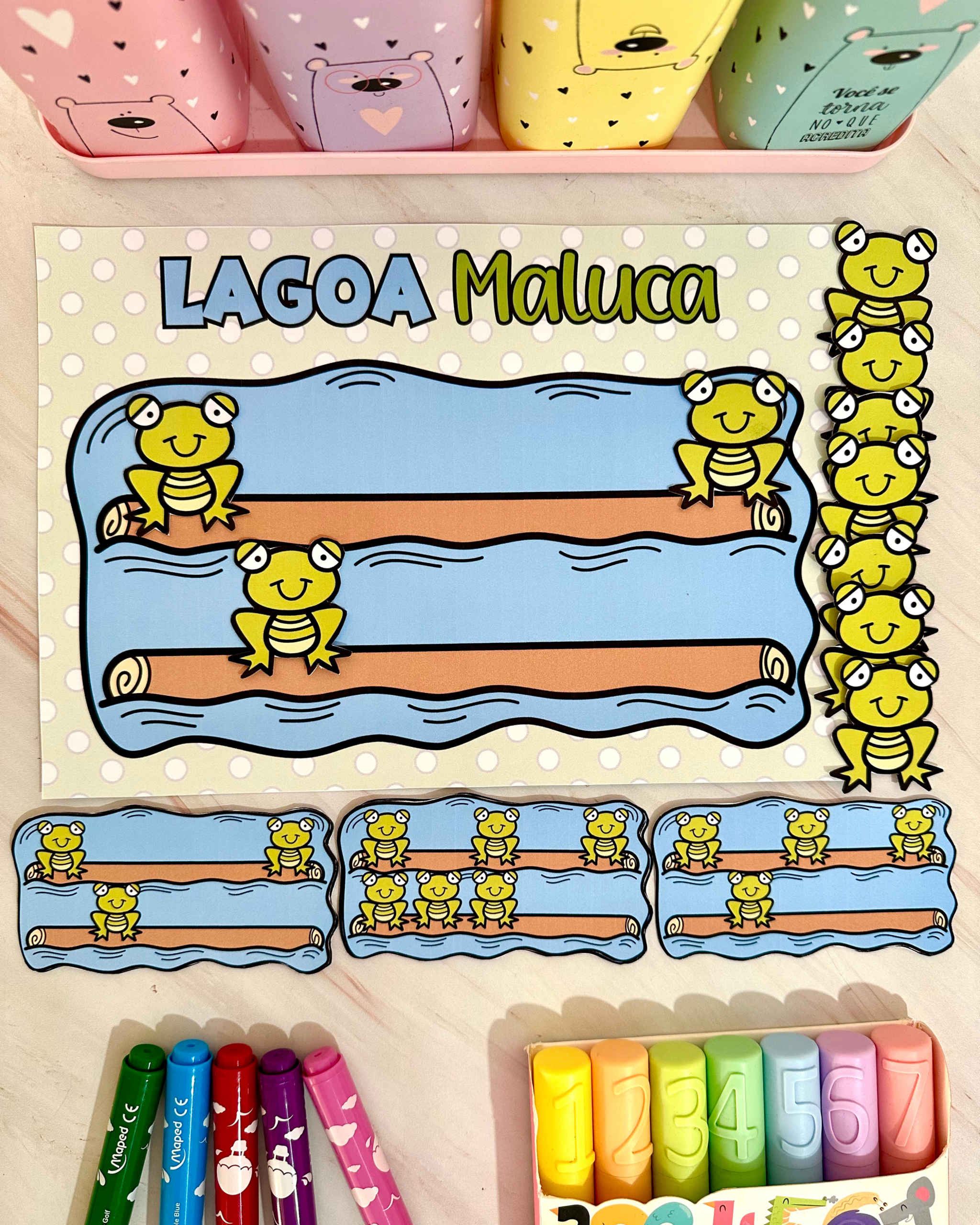 Fichas em formato de sapinhos e lagos para atividades interativas.