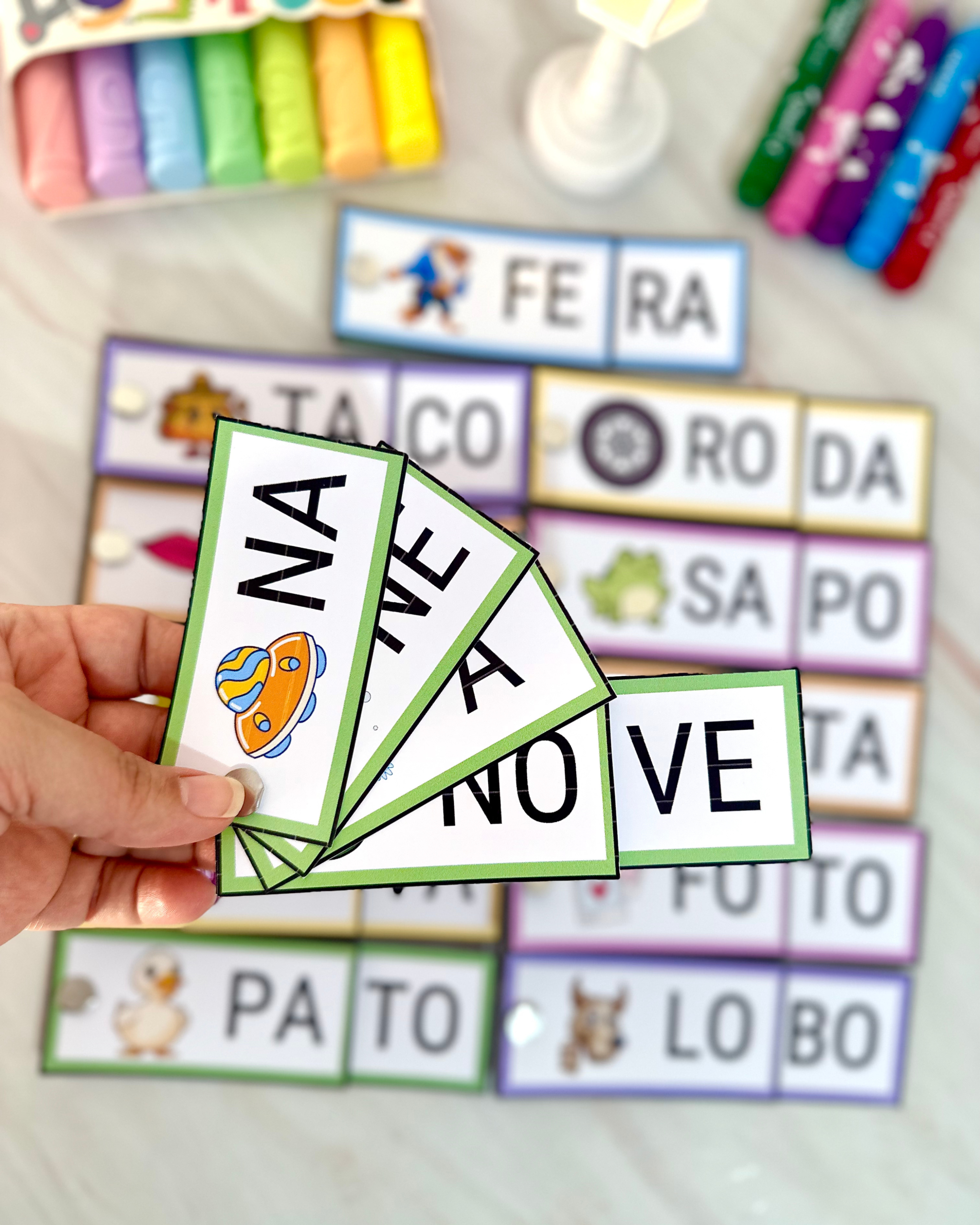 Diversas fichas interativas e ilustradas para apoiar a alfabetização.