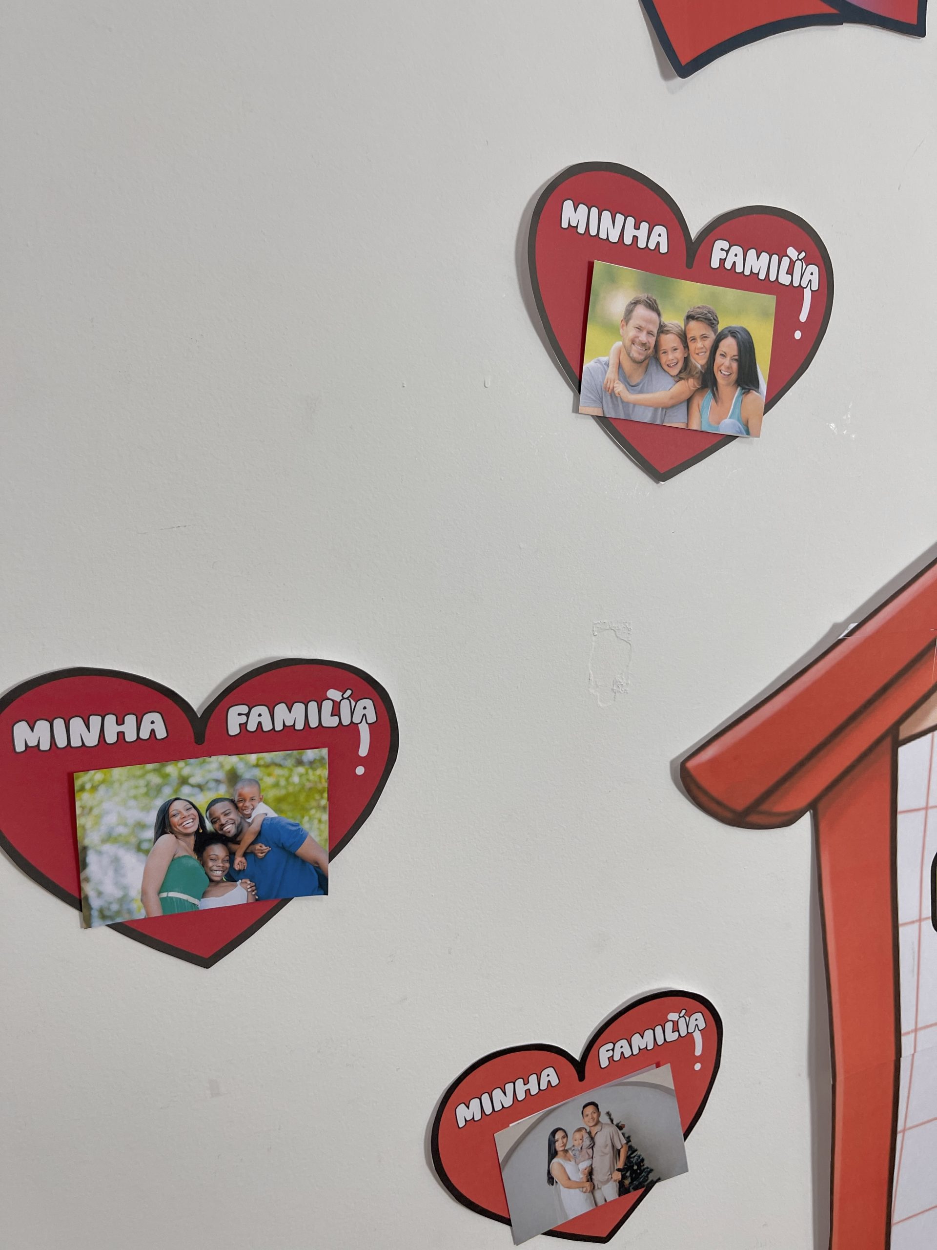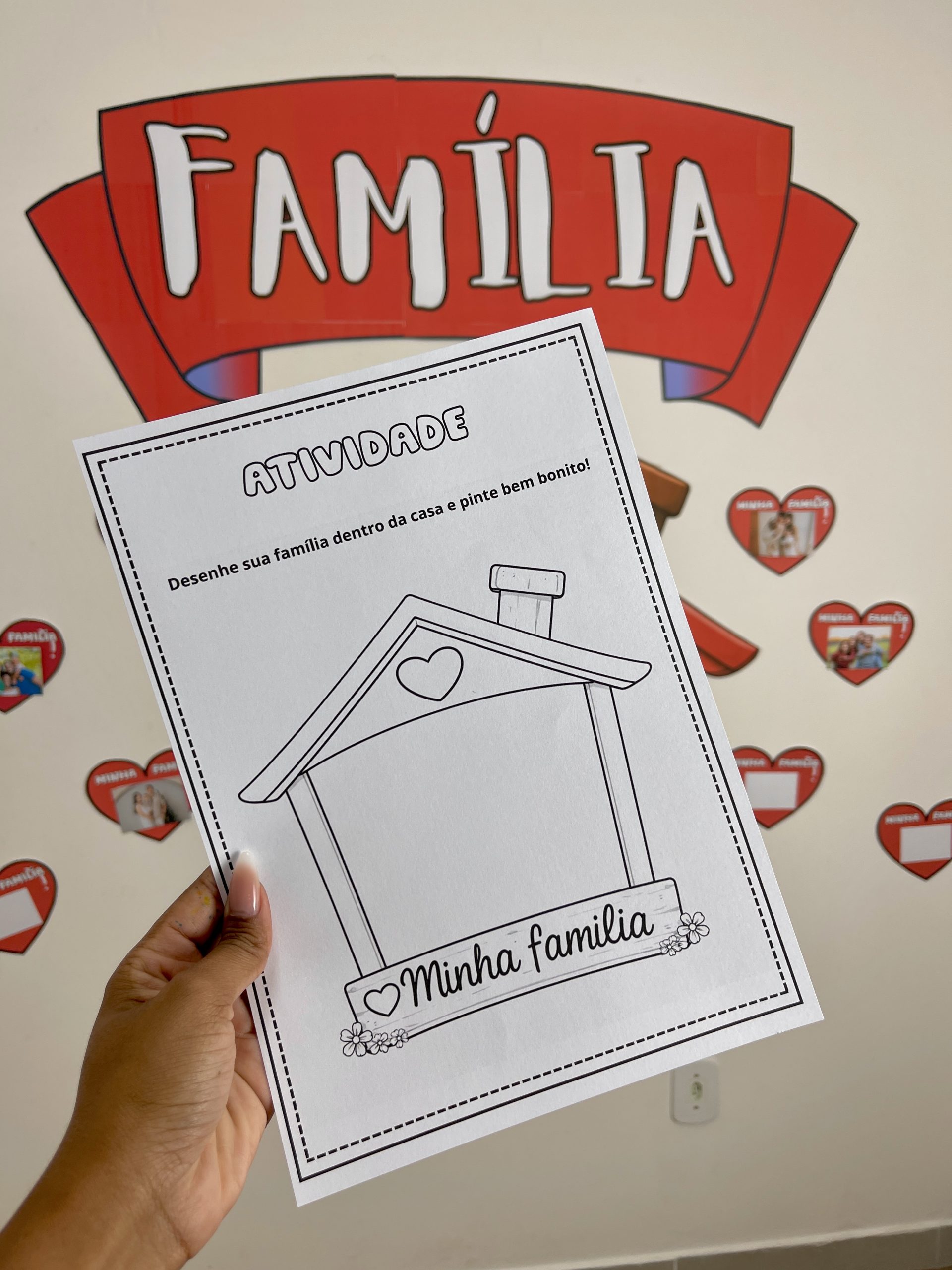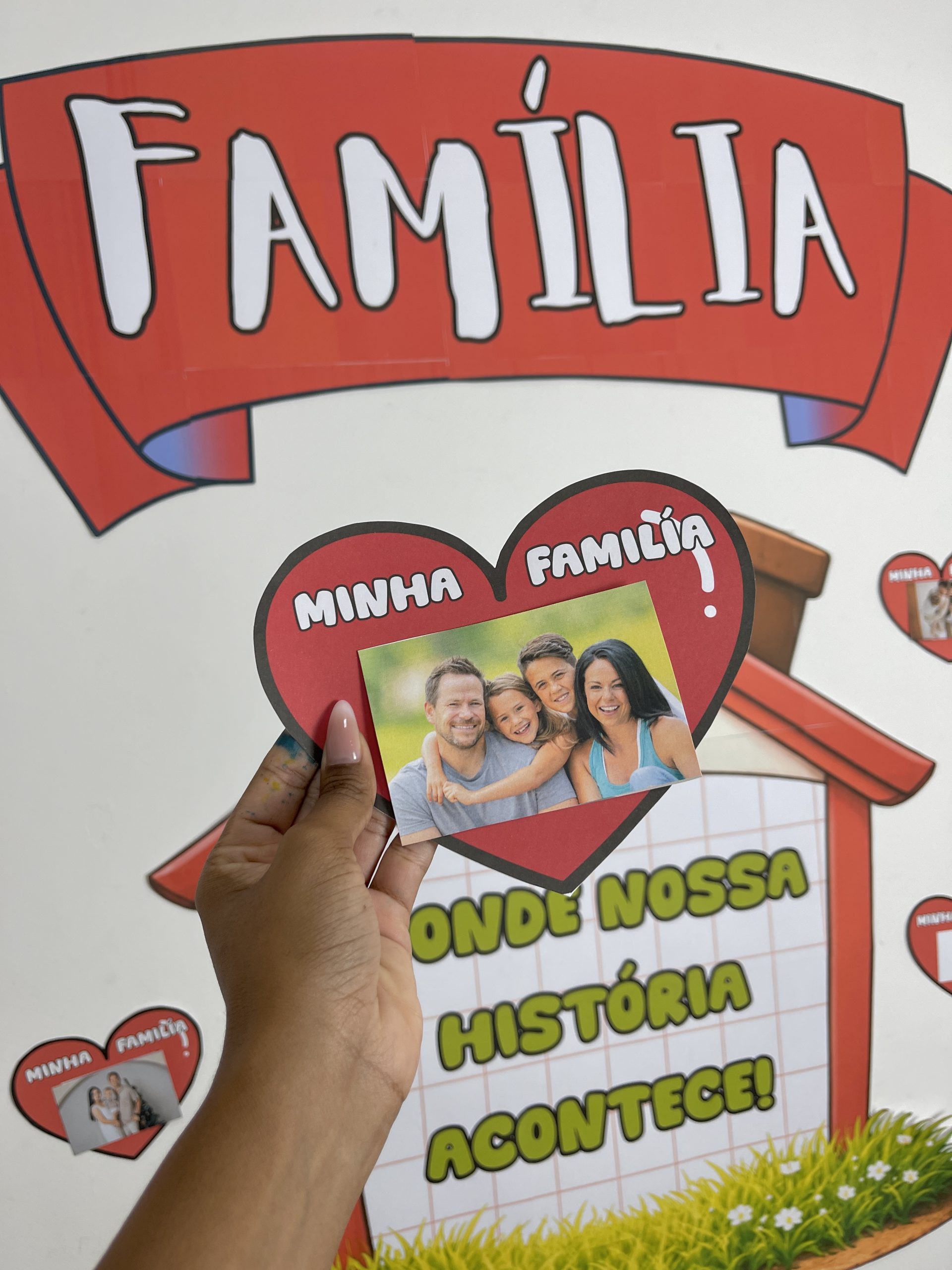 As crianças podem colar fotos da própria família nos corações, montando um painel personalizado, repleto de histórias, memórias e carinho.