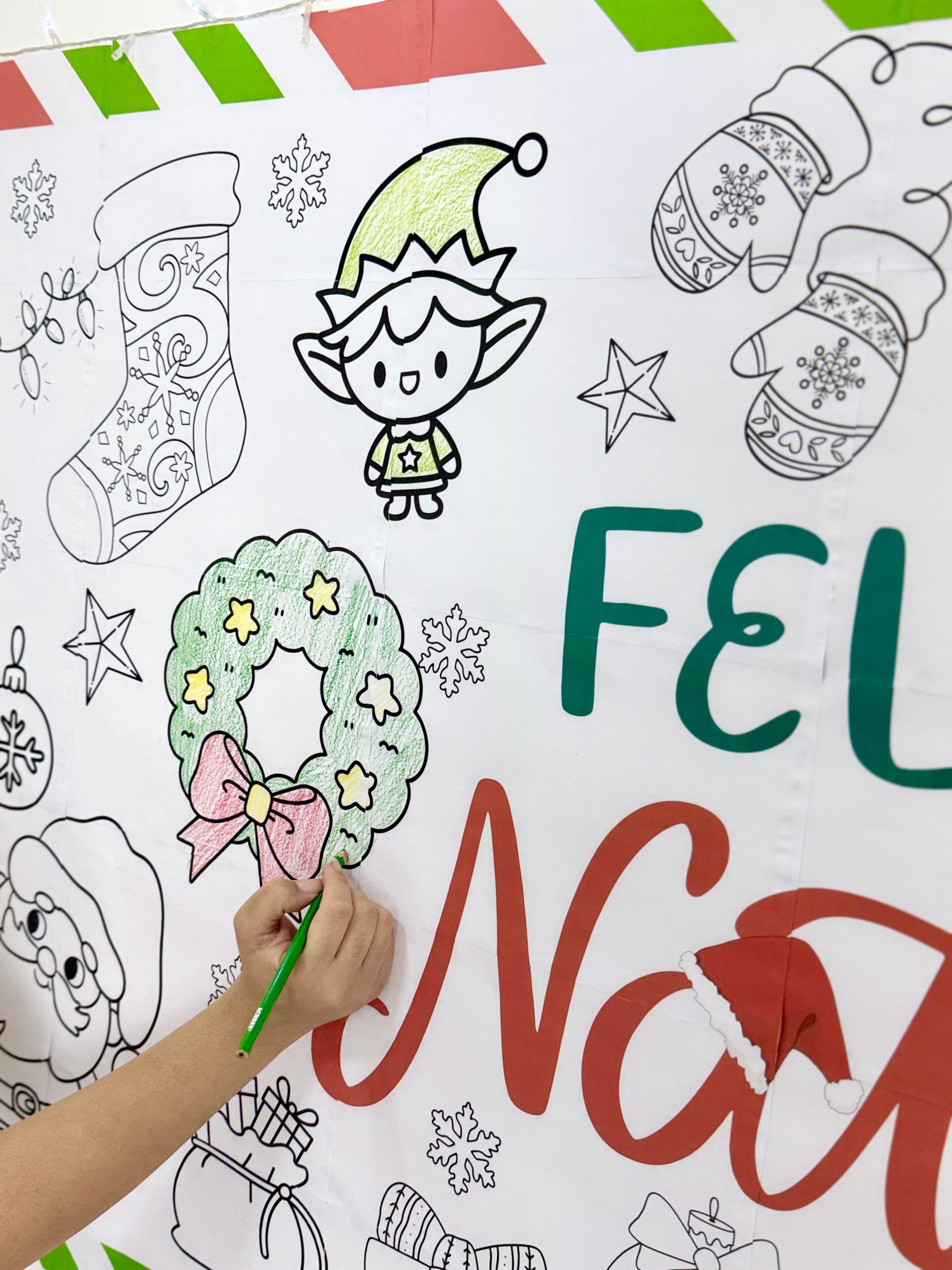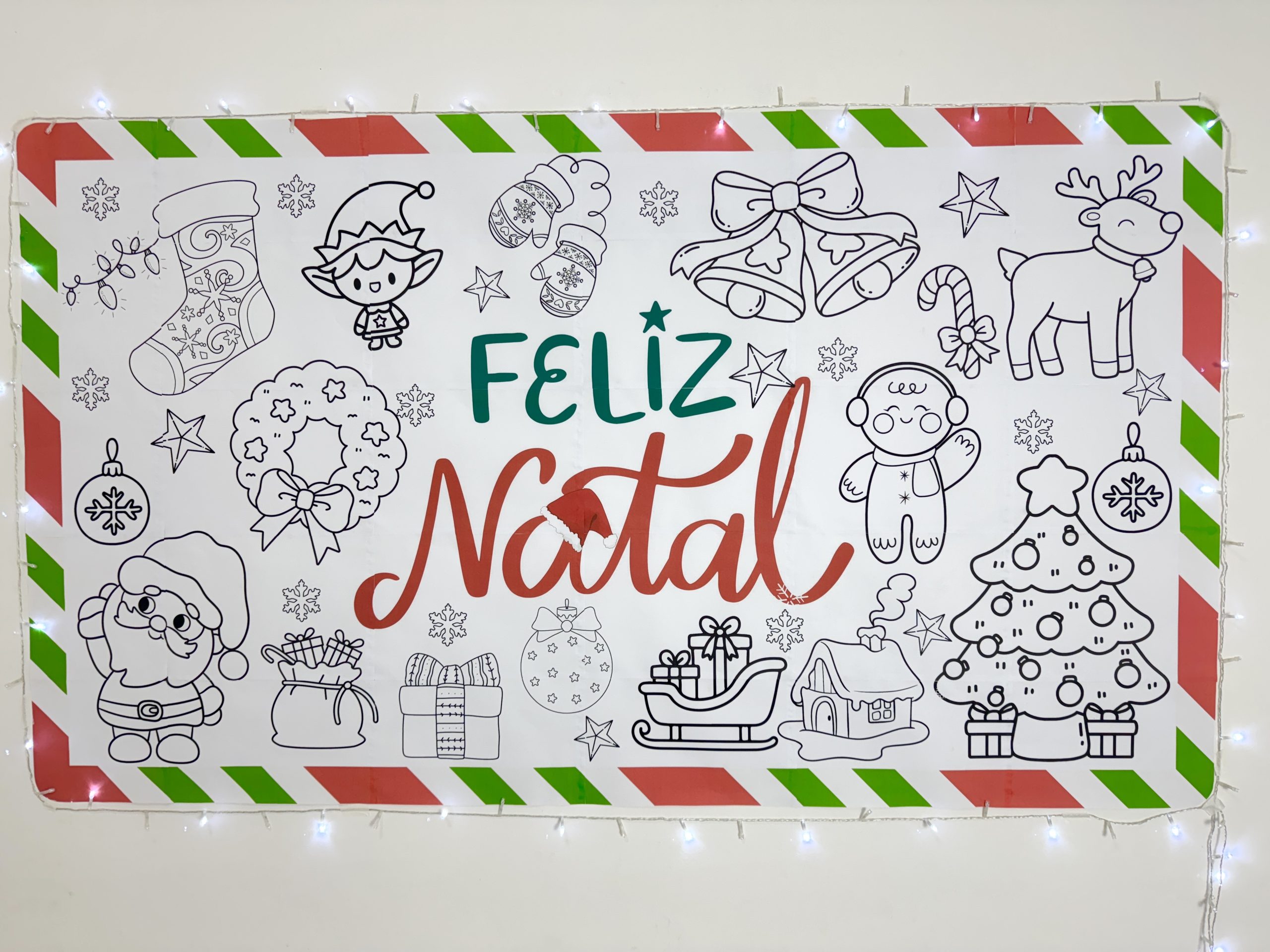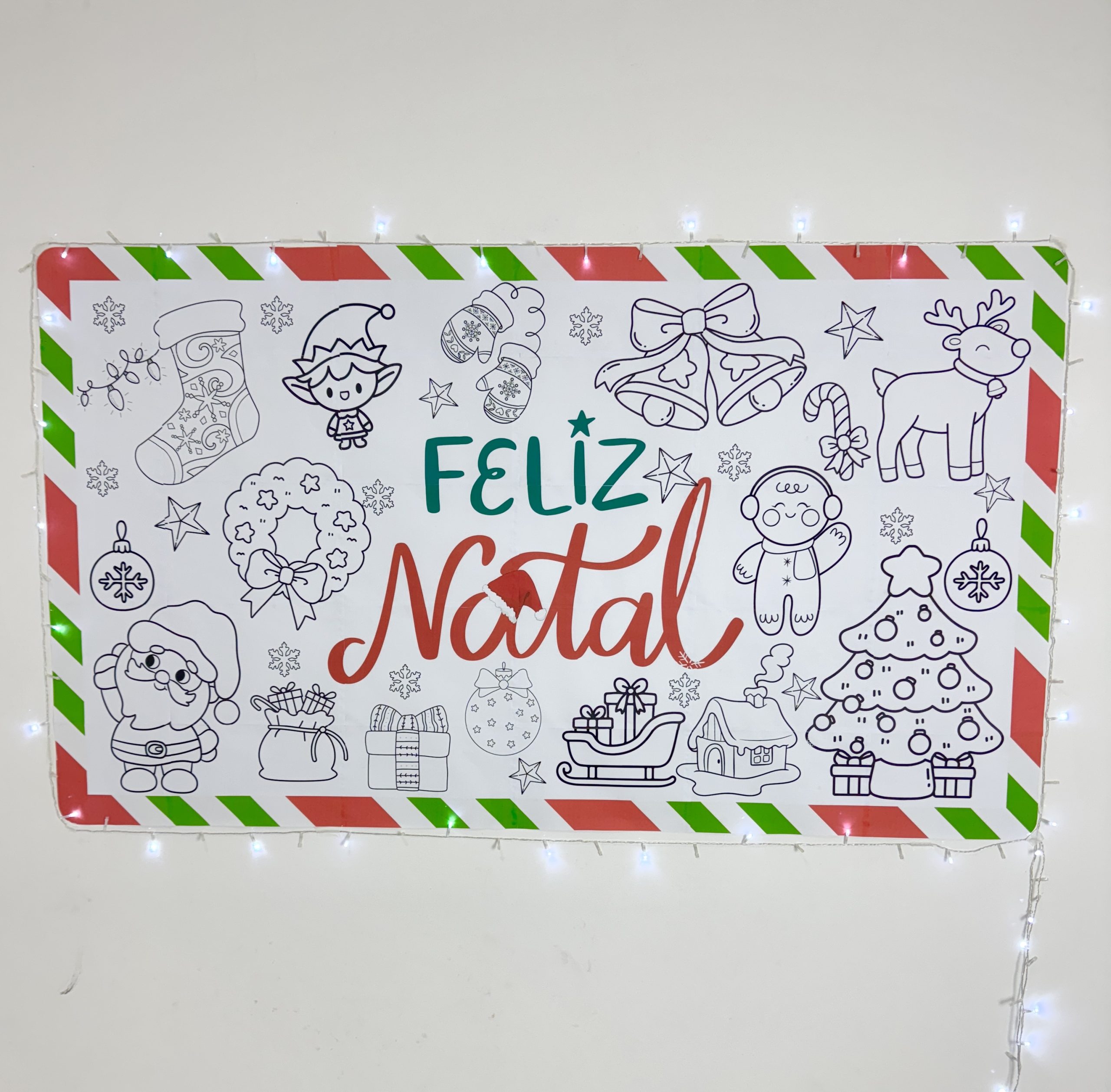 Com o Painel Natalino de Colorir, as crianças mergulham em uma experiência encantadora de arte e imaginação — dando vida aos símbolos mais queridos do Natal, como Papai Noel, renas, árvore, presentes e muito mais!