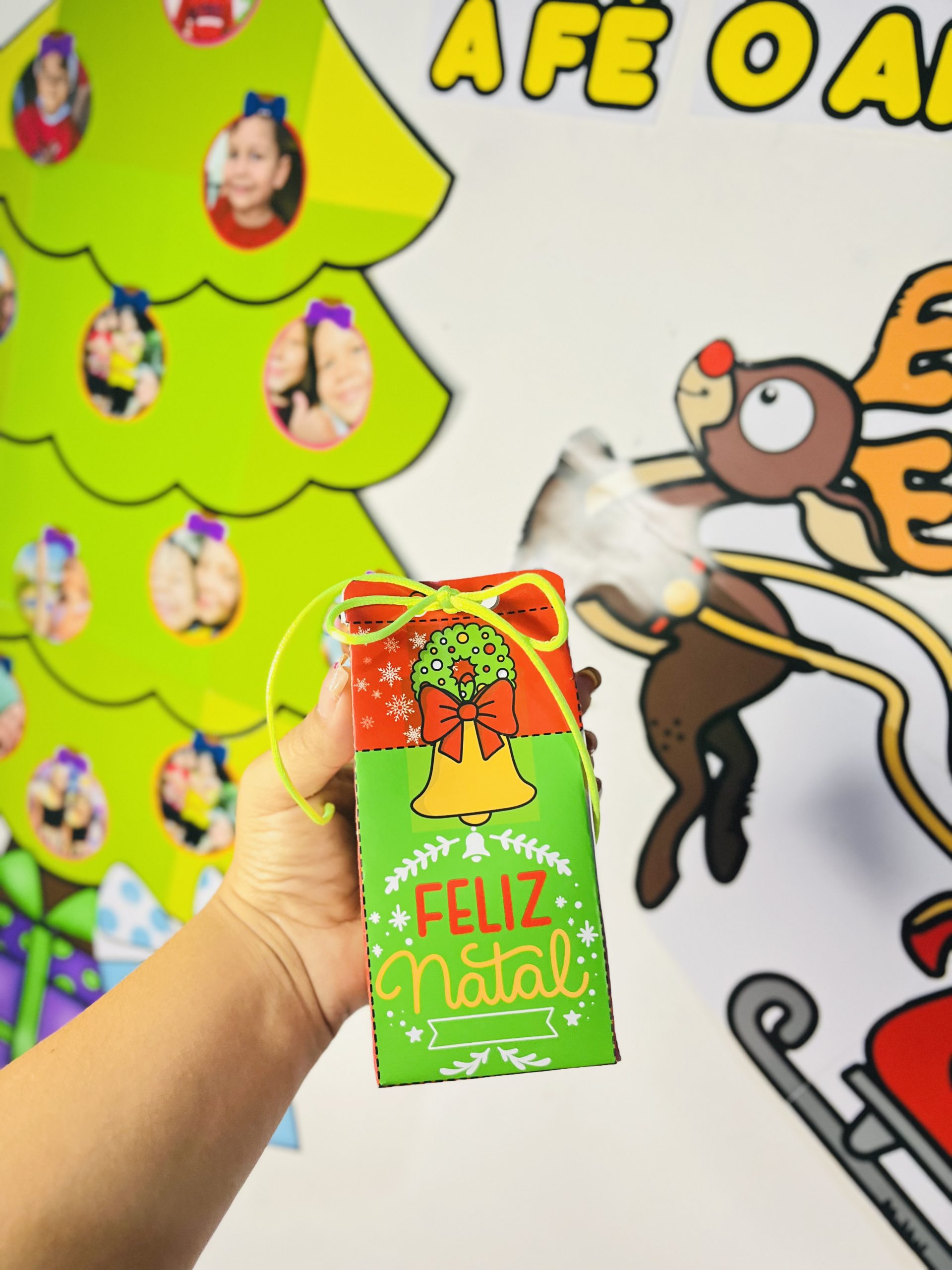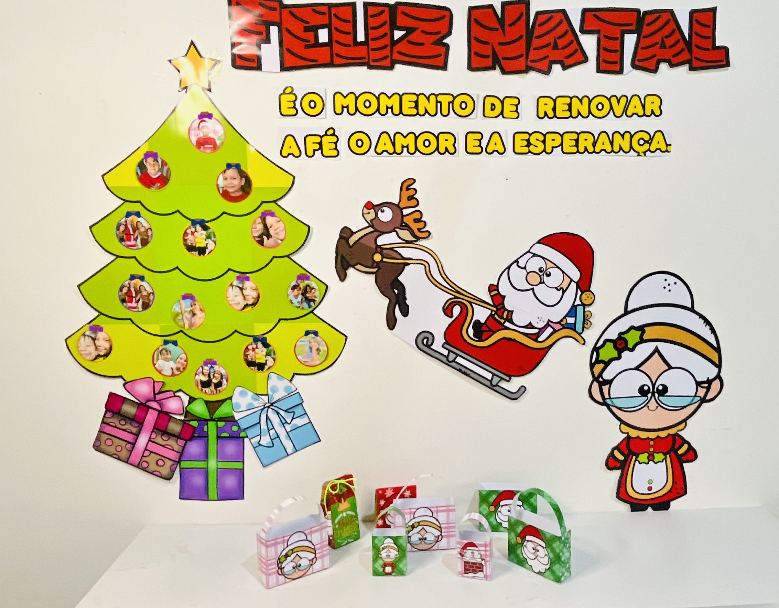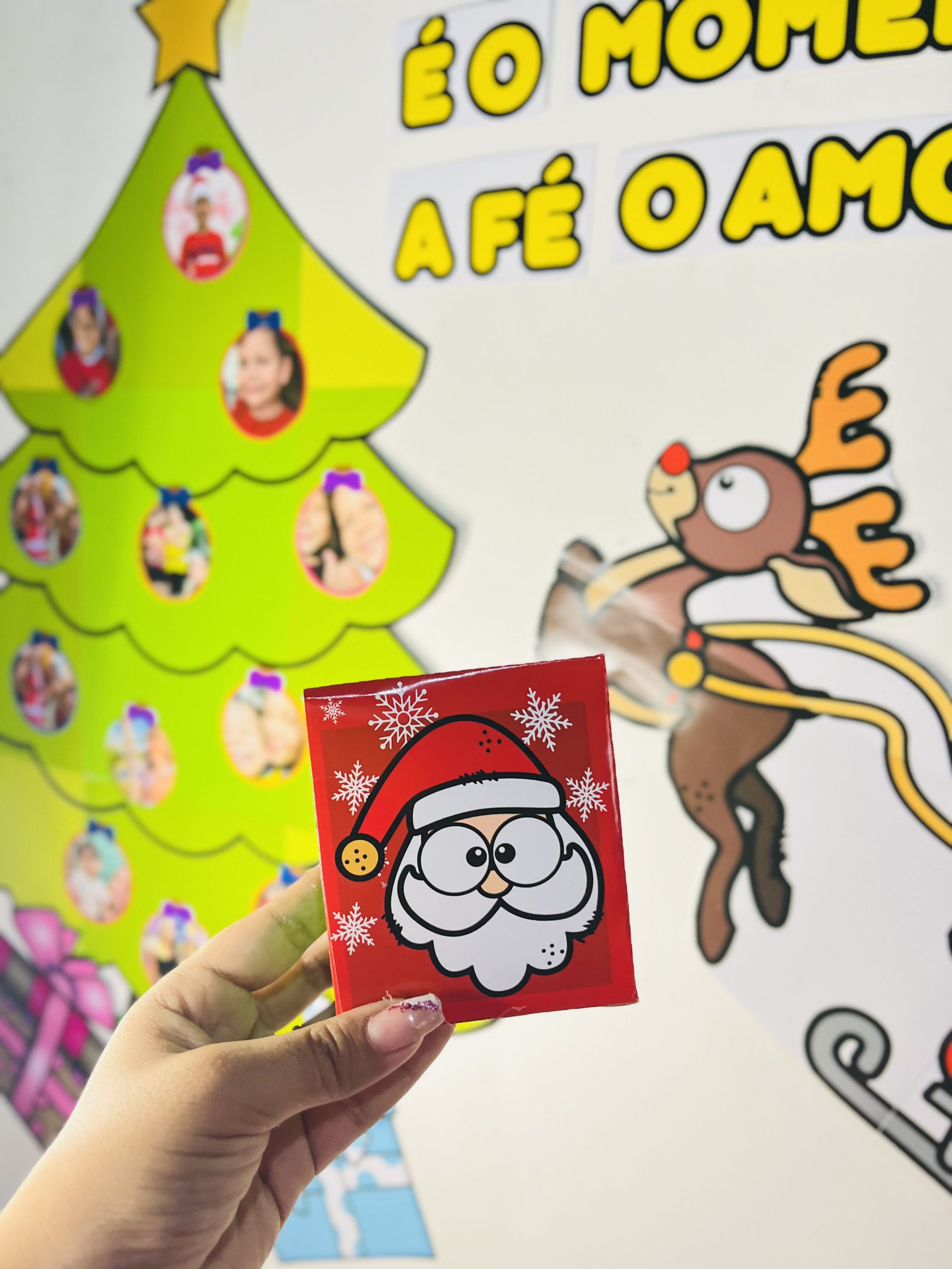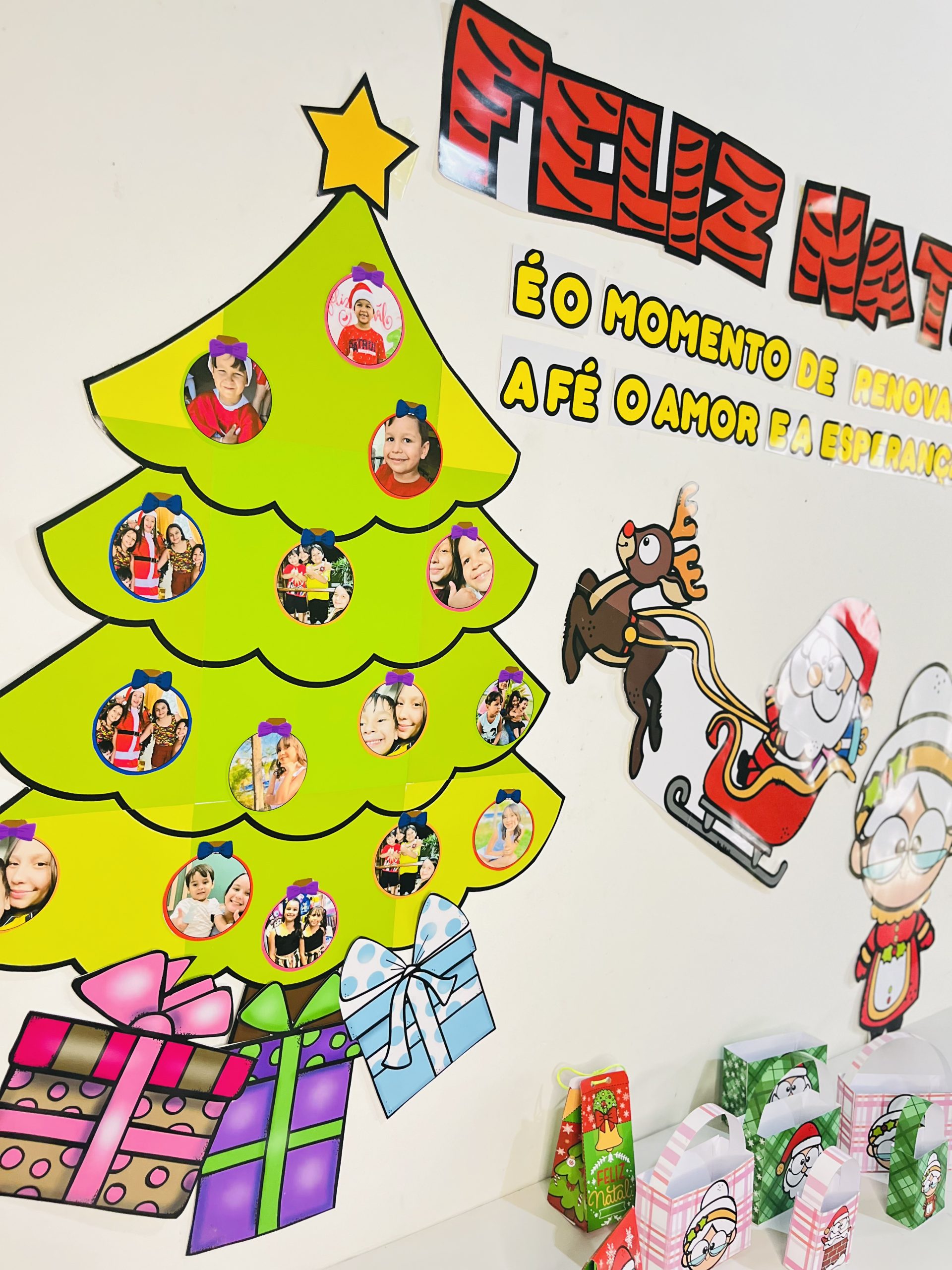 Personalize a árvore de Natal com fotos dos alunos, criando uma decoração única, afetiva e cheia de significado.