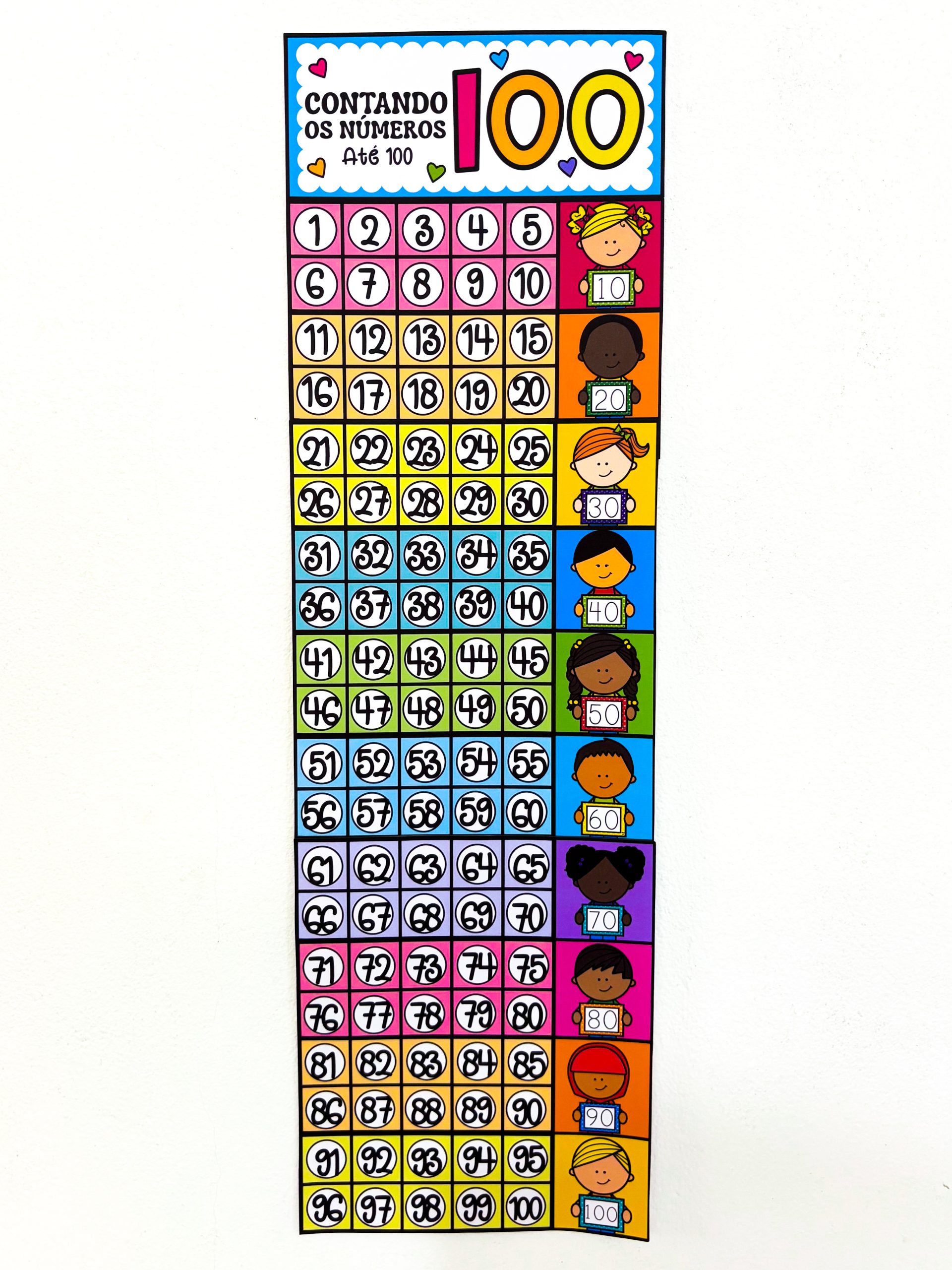 O quadro numérico até 100 foi pensado para apoiar as aprendizagens do dia a dia, auxiliando principalmente na contagem, no reconhecimento dos numerais e nas atividades de rotina.